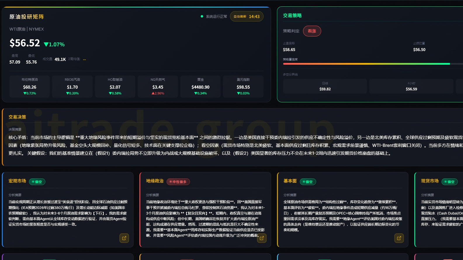 突破单一分析维度。我们的系统模拟顶级投研团队,由“宏观”、“地缘”、“基本面”、“技术”等多个智能体分工协作、交叉验证,为您呈现立体的市场博弈图谱,而不仅仅是结论。